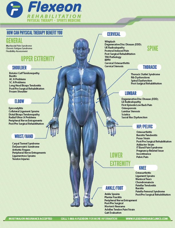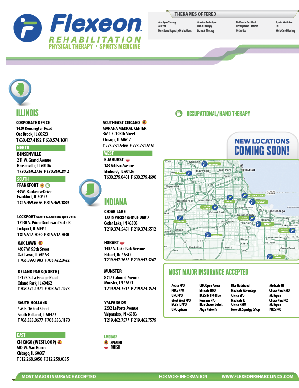 This was a single page info sheet that was created as part of Flexeon Rehabilitation’s marketing material. This front and back piece listed out some common issues a person can experience and the location of all of our clinics. This documentation was distributed to all of our 15 clinics as well as surrounding physician offices. It was also used in our marketing packet that our business development managers used when they went out to meet with doctors and hospitals.