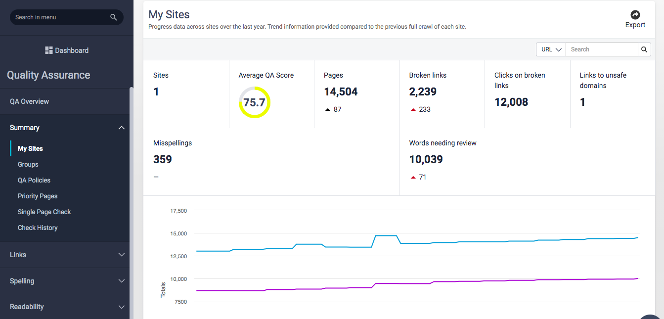 The analytics portion of my duties require me to pull reports and present them to the Assistant Vice-President as well as other members of the senior leadership team. The quality assurance/web governance module is where I spend most of my time and what I enjoy doing. This aspect of the tool crawls the whole site and assigns an overall DCI (Digital Certainty Index) score that is regularly adjusted to reflect the changing digital environment.