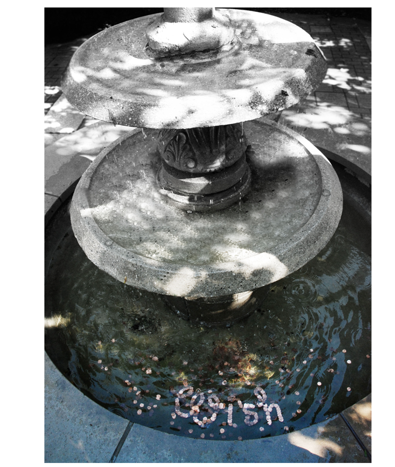 “Wish” was a project that I did for my typography class. This project consisted of choosing a typeface and a word and then creating a story. I chose the word “Wish” with the typeface pictured here. I then decided to build a narrative of a wishing well or fountain. I made the word more detailed and printed out the text and cut out a template. From there, I bought a lot of pennies and glued them together using the template I printed so they were about an inch tall. I then chose a location that had a running fountain and placed the words there. I took a handful of pictures and then manipulated those in Photoshop. I started by editing out the pipes in the fountain to make it look cleaner and tweaking some lighting. To complete the project and make the image more dramatic, I gray scaled the entire image and added a layer mask with full color.